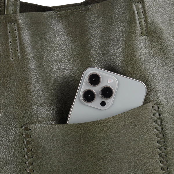 Minimal form. Maximum function. This go-to tote is crafted in supple leather with a naturally lightweight feel + an authentic raw interior. Inside, a dropdown leather zip pocket + two slender slip pockets keep small essentials—lipsticks, pens, or earbuds—secure within reach. Sleek exterior is accented with a front pocket + a hand-stitched whipstitch border, adding subtle texture + artisanal detail without sacrificing simplicity.
