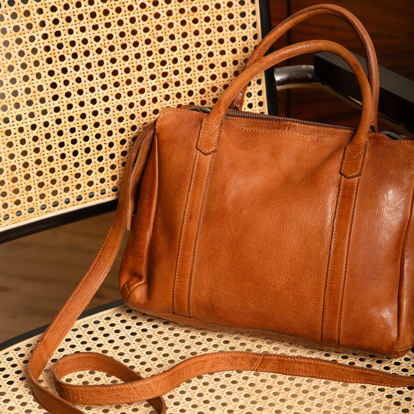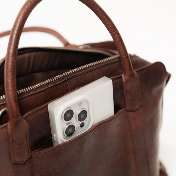 James is a polished everyday bag with the flexibility to match your style. Carry it by the rounded handles for a refined look or use the adjustable crossbody strap for hands-free ease. A hidden phone pocket offers quick access, while the interior keeps everything in order with pockets, card slots, and pen holders. Crafted from premium full-grain leather and lined in soft cotton twill, James is built to last and look better with time.