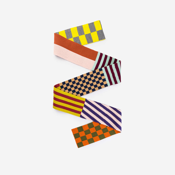 A long skinny knit scarf with contrasting graphic pattern blocks. Colorful, reversible, and unisex. For indoor and outdoor wear. Can be tied and wrapped in many different ways depending on weather or mood. Knit with repurposed deadstock yarn.