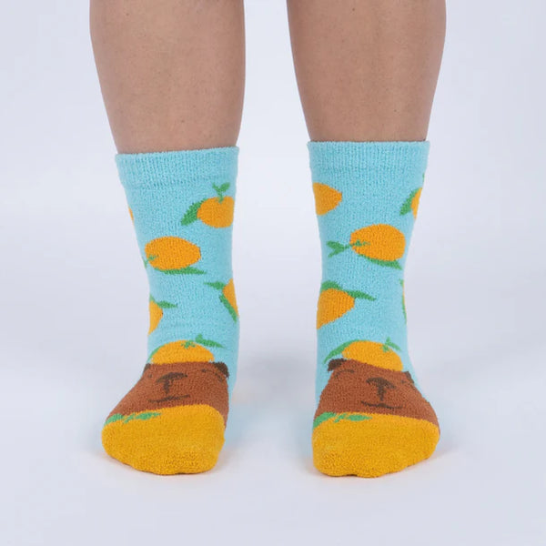 Bring spa-day vibes to your feet with slipper socks featuring a chilled-out, bathing capybara. Fuzzy-soft texture and grippy soles make them perfect for slow living, self-care days, or gifting to capybara fans who love cozy, feel-good loungewear.