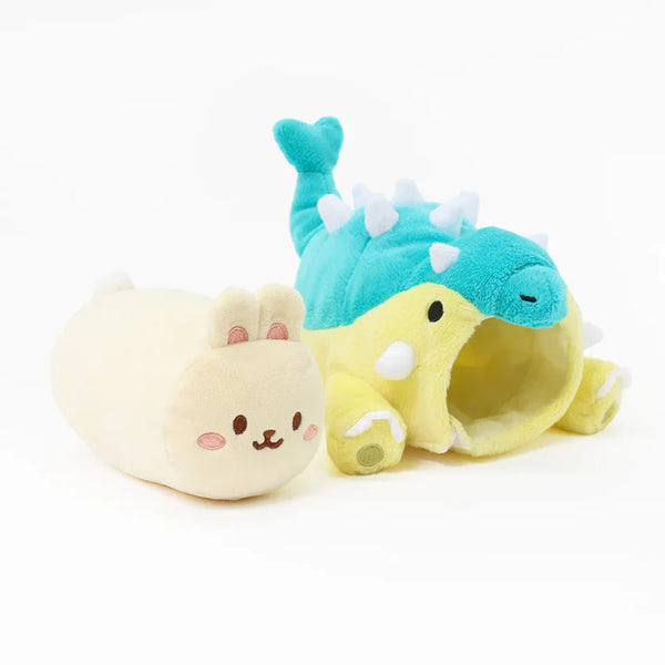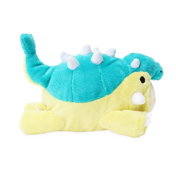 This spiky dino is ready to roll!🐰Bunniroll is dressed as a playful ankylosaurus with a teal-blue shell, white plush spikes, and a curved tail. The vibrant yellow base and claw detail make this Ankylosaurus Bunniroll Small Plush Outfitz a standout in any collection.