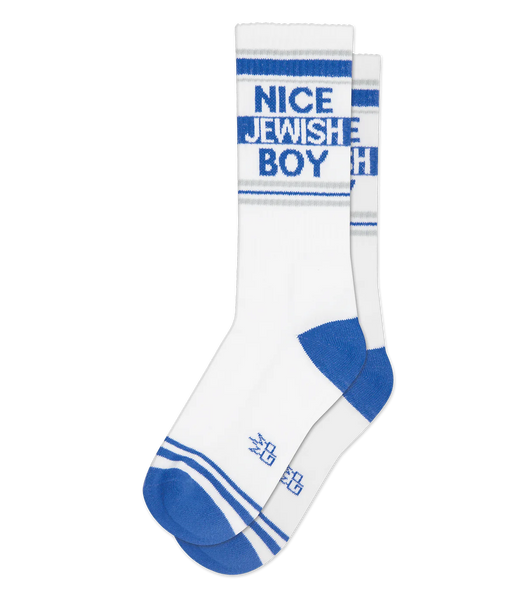 These super-comfy, unisex, one-size-fits-most, Gym Socks are made in the USA of Bleach White Cotton with accents of Brite Royal Cotton, Gray Cotton.